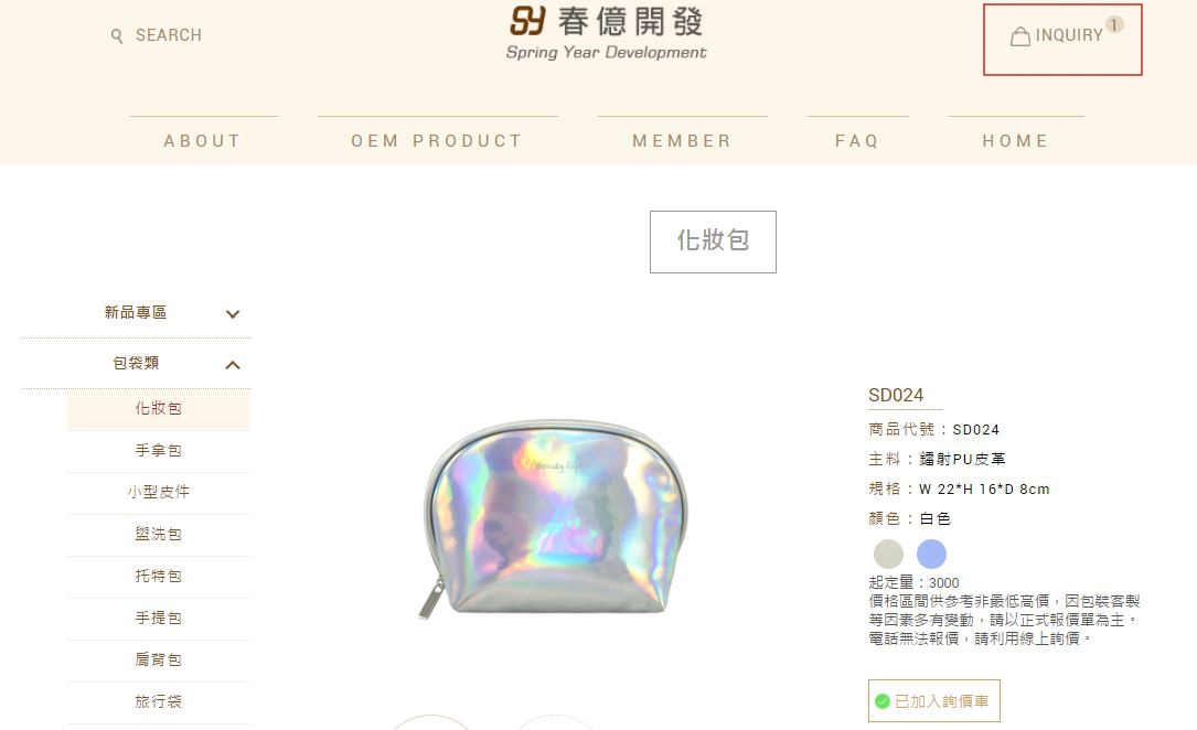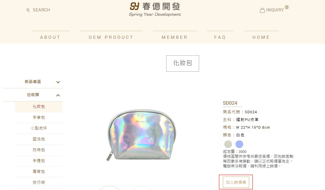1.瀏覽商品,在喜歡的商品頁面裡,點擊右下方”加入詢價車”