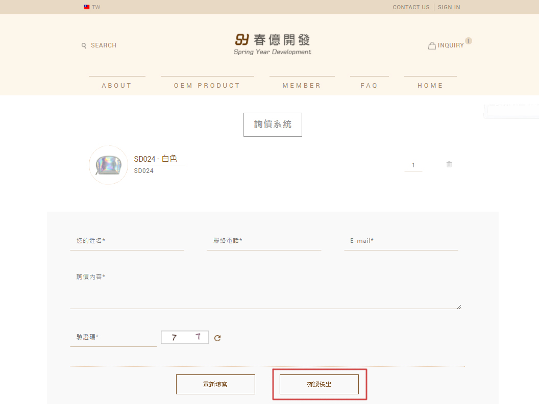 3.點擊右上角”INQUIRY”會進入本畫面,請將下方的表單填寫完畢,並確認送出;